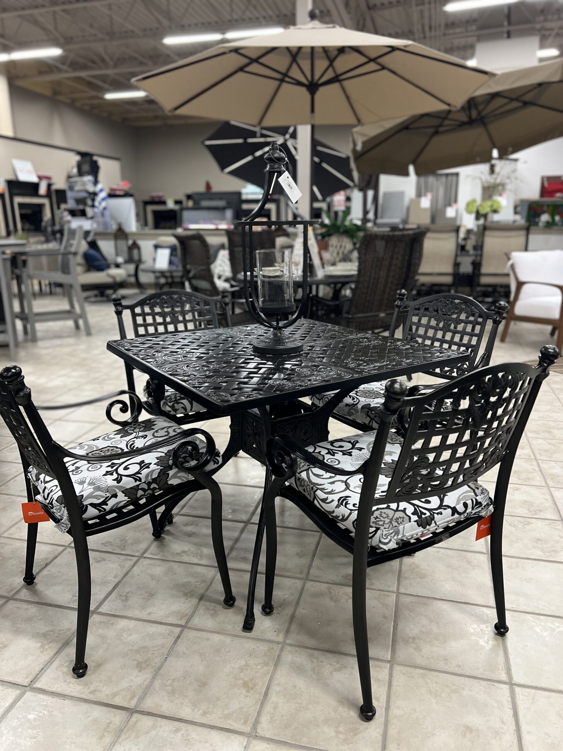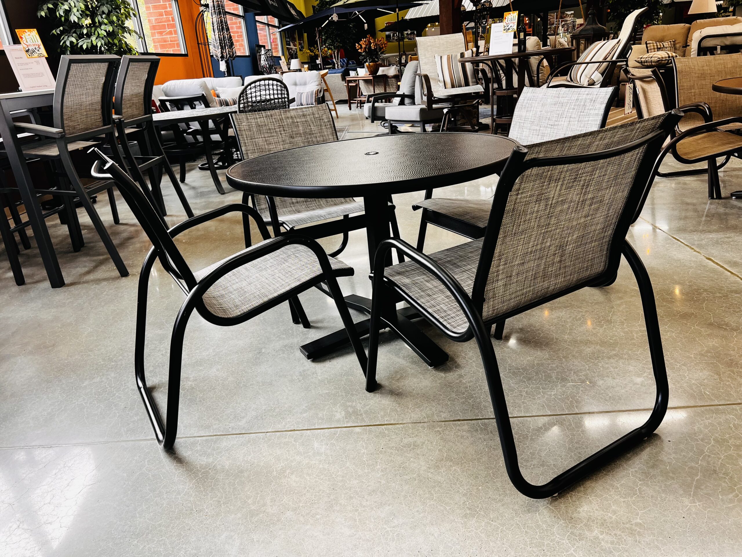 Torino Dining Group includes 48" Cast Aluminum Dining Table with Four Swivel Dining Chairs (Seat Cushions included!)