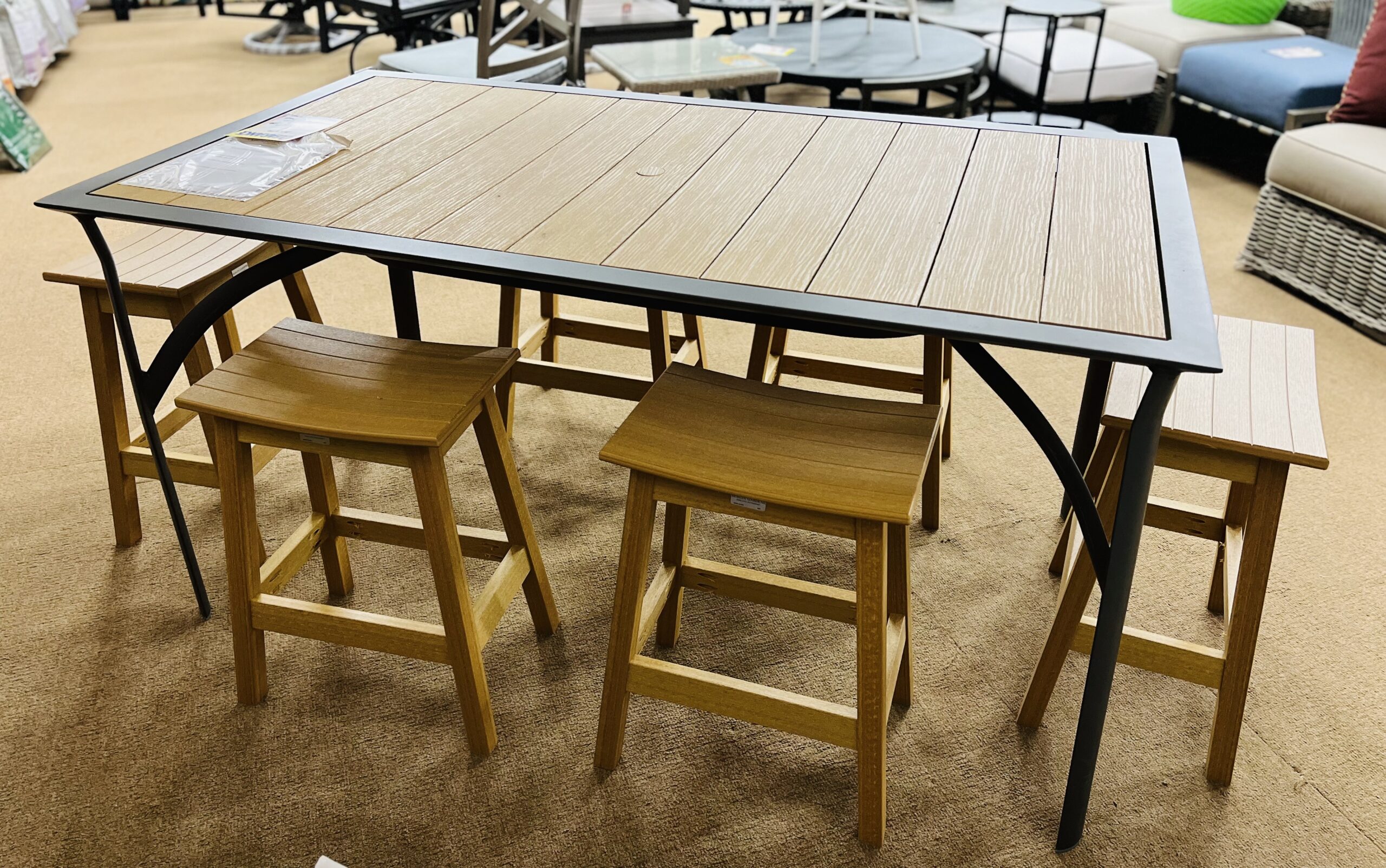 Set includes Rectangular Rustic Polymer Table and Four Bar-Height Sling Chairs