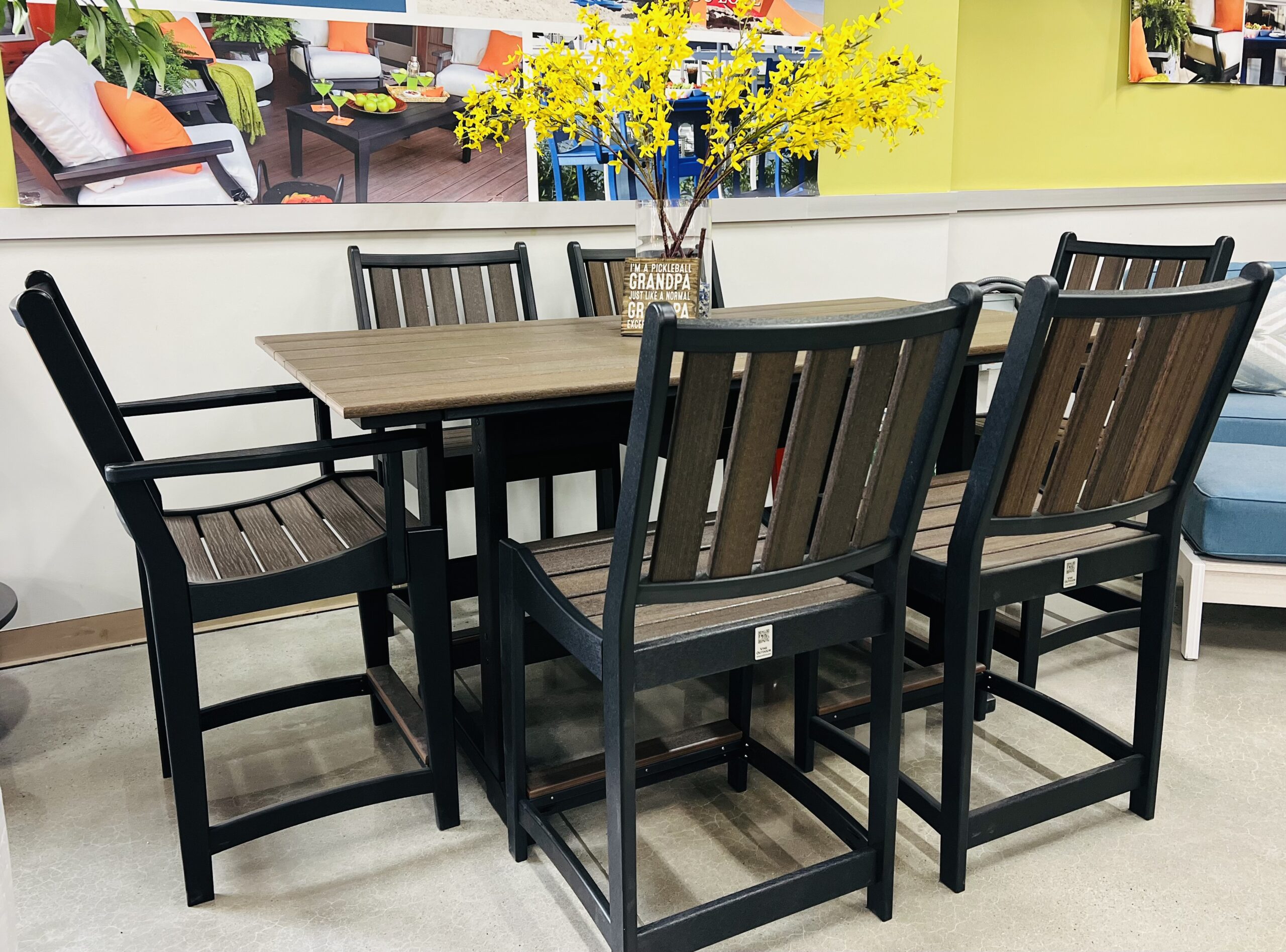 Patio Express Poly-Bar Set Includes 38"x72" Counter Table, Four Counter Bar Chairs, and Two Counter Arm Chairs.